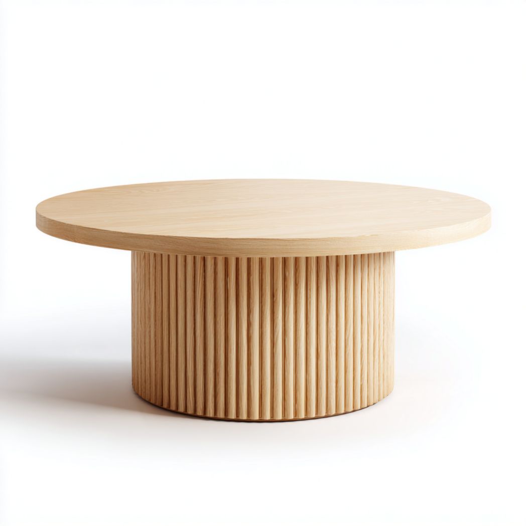 Table basse ronde en bois clair avec base cylindrique rainurée